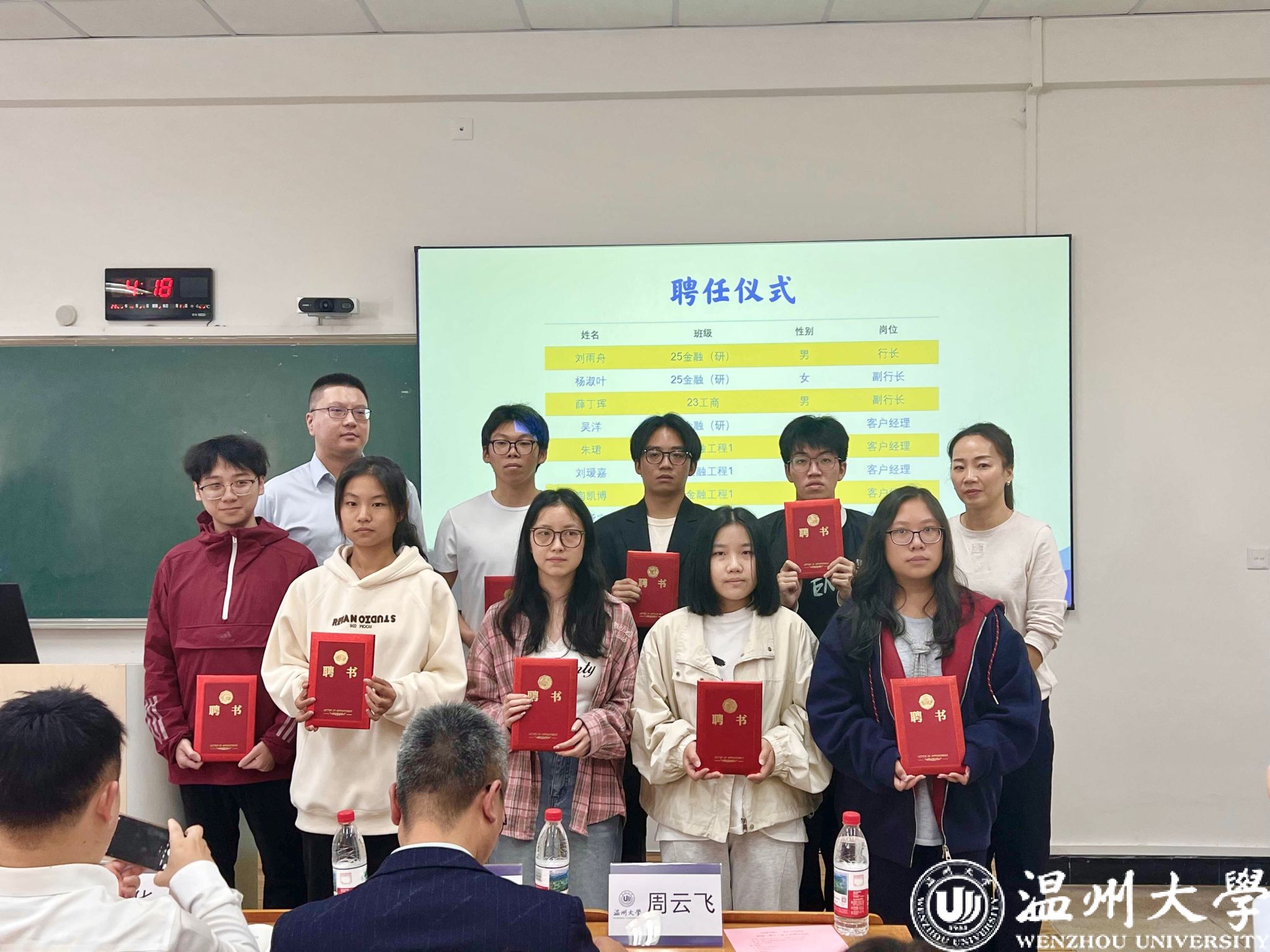 仪式中,中国建设银行温州市分行领导为8名受聘学生颁发聘书。新一届团队由1名行长、2名副行长和5名客户经理组成,涵盖本科与研究生群体,均经学院严格选拔产生。